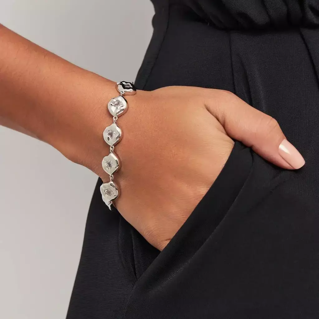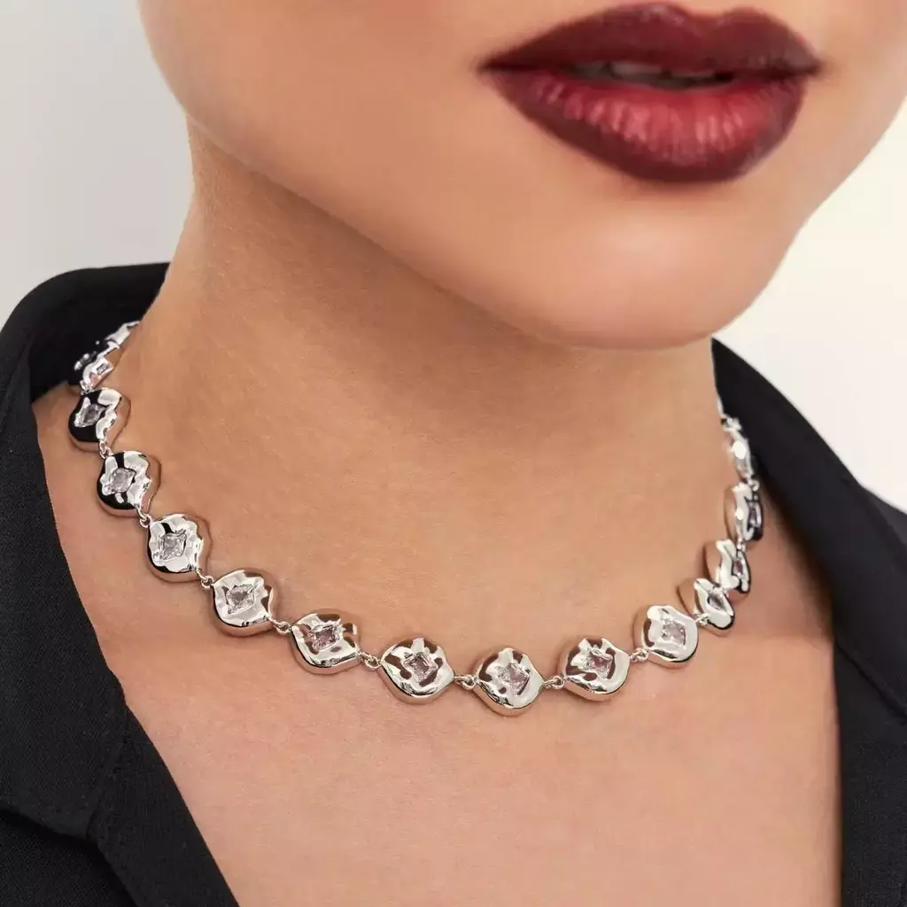 Conjunto sofisticado em banho de ródio composto por colar e pulseira com design de formas geométricas irregulares conectadas e acabamento texturizado que captura a luz com elegância. As peças trazem um visual moderno e orgânico, perfeito para quem busca joias versáteis que transitam do dia a noite com sofisticação. Fechos ajustáveis para conforto perfeito. Disponível em banho de ouro 18k e ródio.